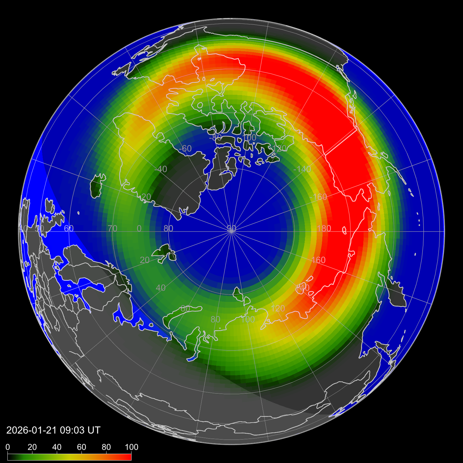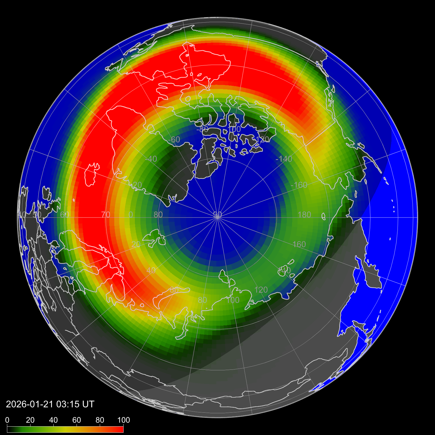 Индекс интенсивности полярных сияний и теоретически возможная широта наблюдений для ночного времени в западном полушарии