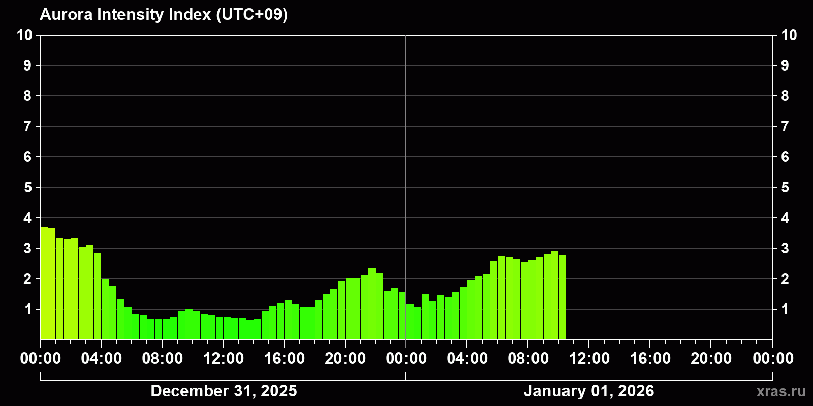Auroral intensity index and the theoretically possible latitude of observations for nighttime in the Estern Hemisphere as of 2026-01-01 06:58 (end of day) local time