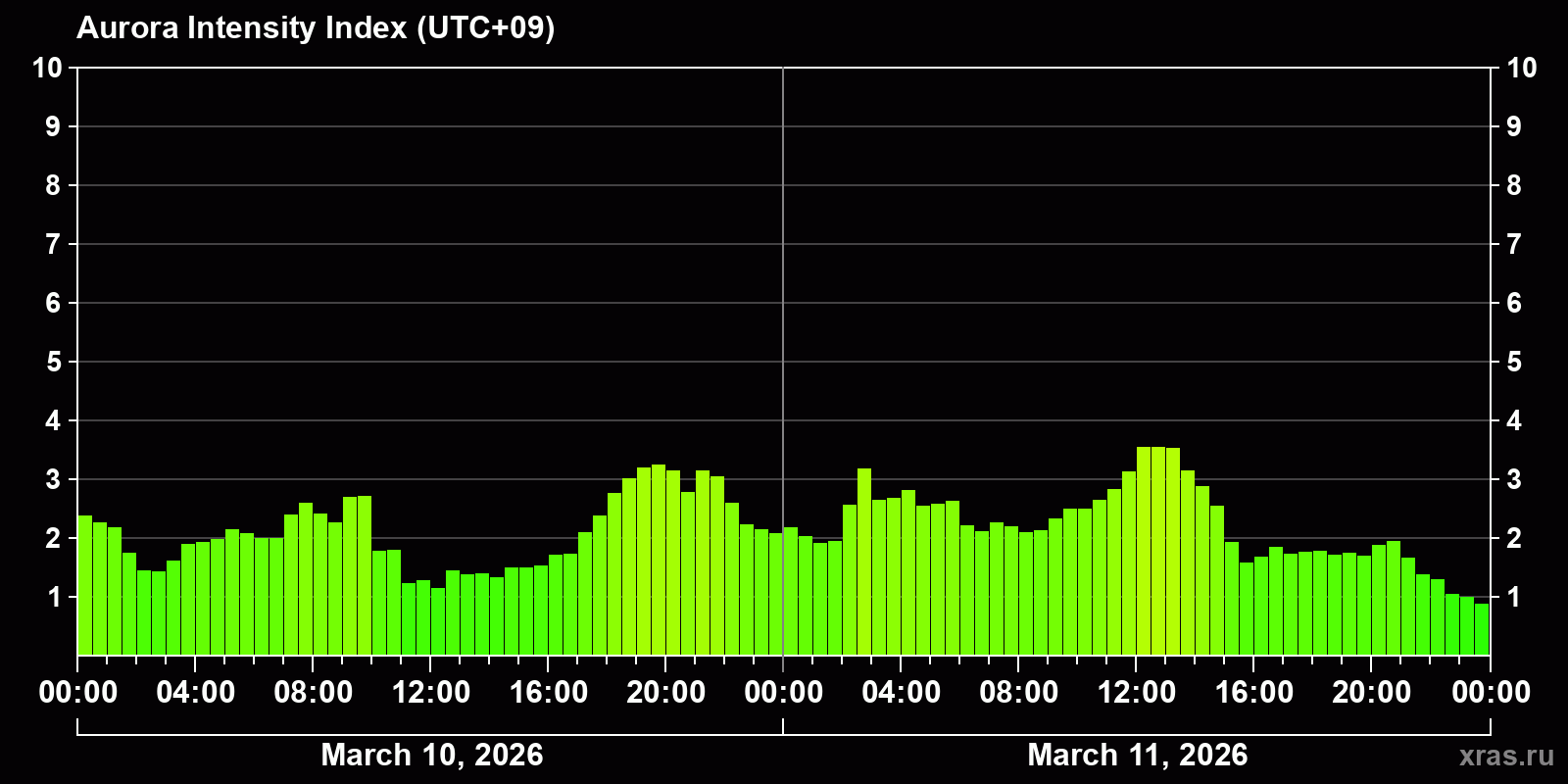 Changes in the auroral intensity index from 2026-03-10 to 2026-03-11 local time