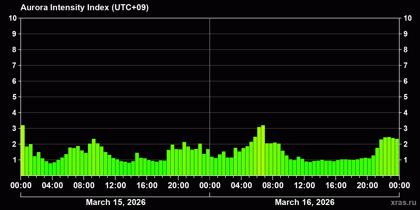 Auroral intensity index and the theoretically possible latitude of observations for nighttime in the Estern Hemisphere as of 2026-03-16 23:55 (end of day) local time