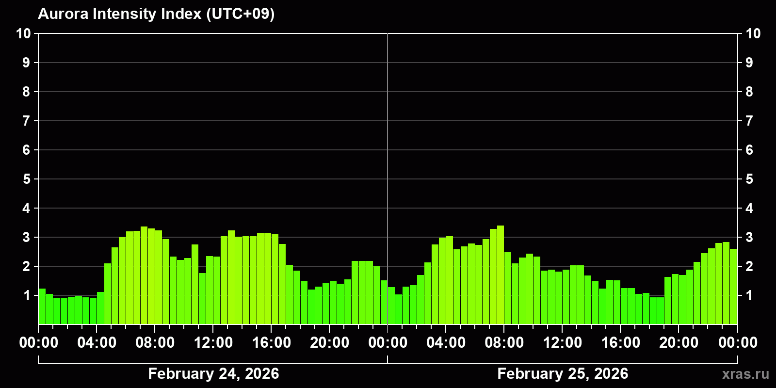 Auroral intensity index and the theoretically possible latitude of observations for nighttime in the Estern Hemisphere as of 2026-02-25 23:59 (end of day) local time