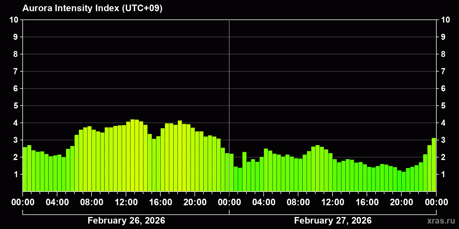 Changes in the auroral intensity index from 2026-02-26 to 2026-02-27 local time