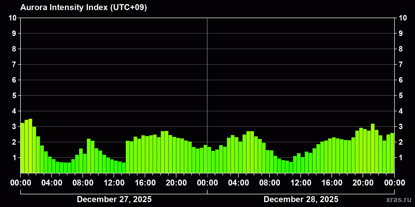 Auroral intensity index and the theoretically possible latitude of observations for nighttime in the Estern Hemisphere as of 2025-12-28 23:59 (end of day) local time