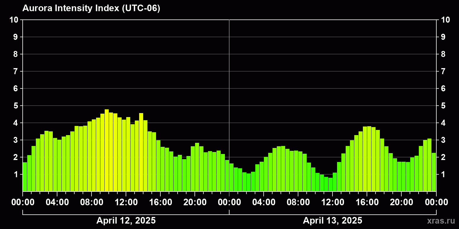 Auroral intensity index and the theoretically possible latitude of observations for nighttime in the Western Hemisphere as of 2025-04-13 23:47 (end of day) local time