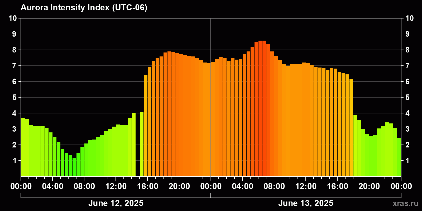 Changes in the auroral intensity index from 2025-06-12 to 2025-06-13 local time