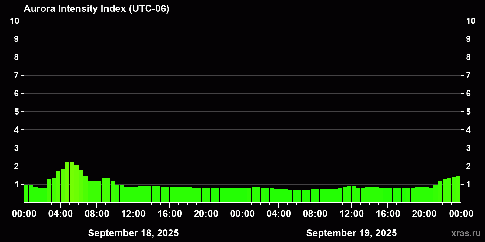 Auroral intensity index and the theoretically possible latitude of observations for nighttime in the Western Hemisphere as of 2025-09-19 23:53 (end of day) local time