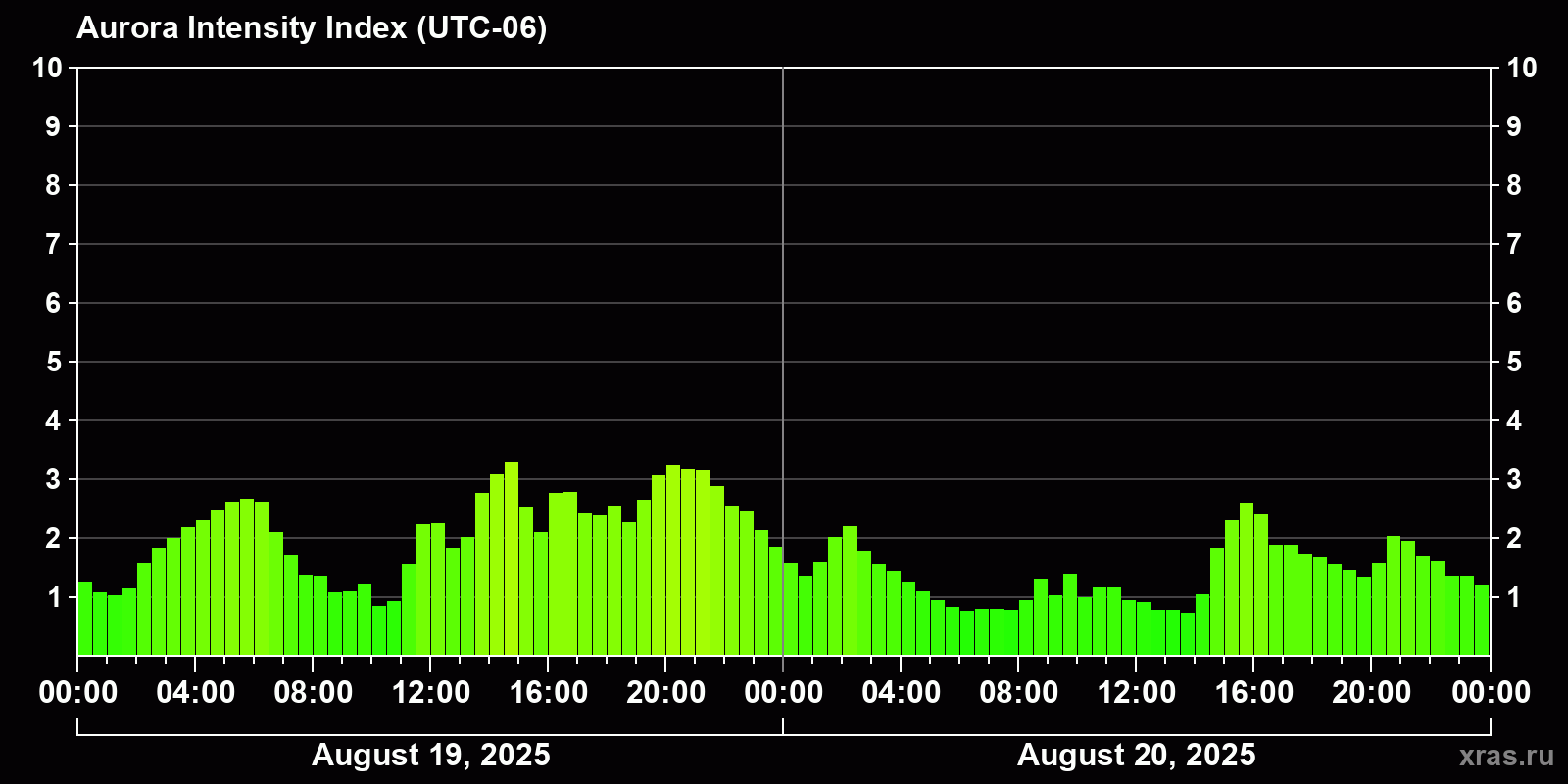 Auroral intensity index and the theoretically possible latitude of observations for nighttime in the Western Hemisphere as of 2025-08-20 23:45 (end of day) local time
