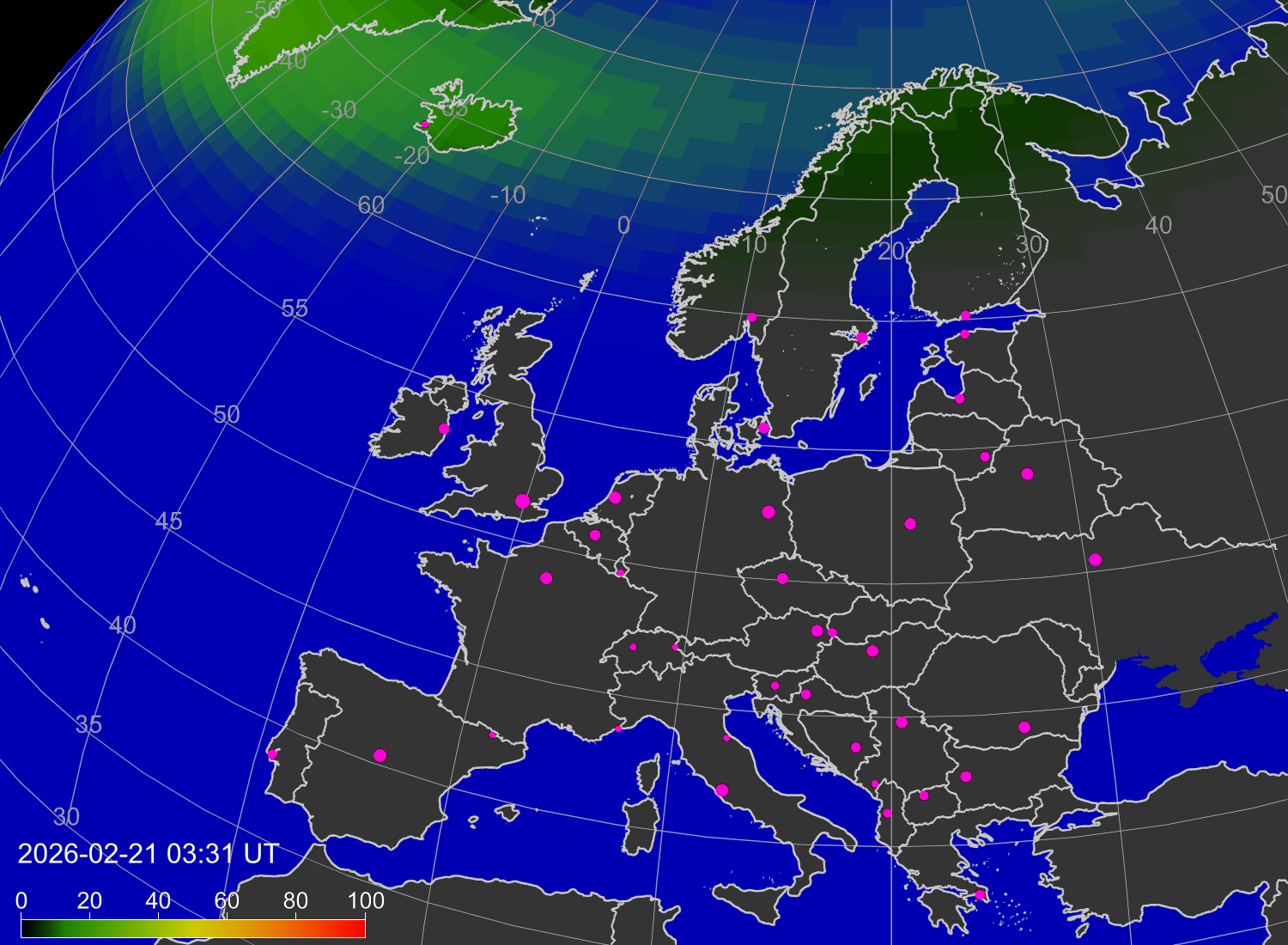 Индекс интенсивности полярных сияний и теоретически возможная широта наблюдений для ночного времени в восточном полушарии