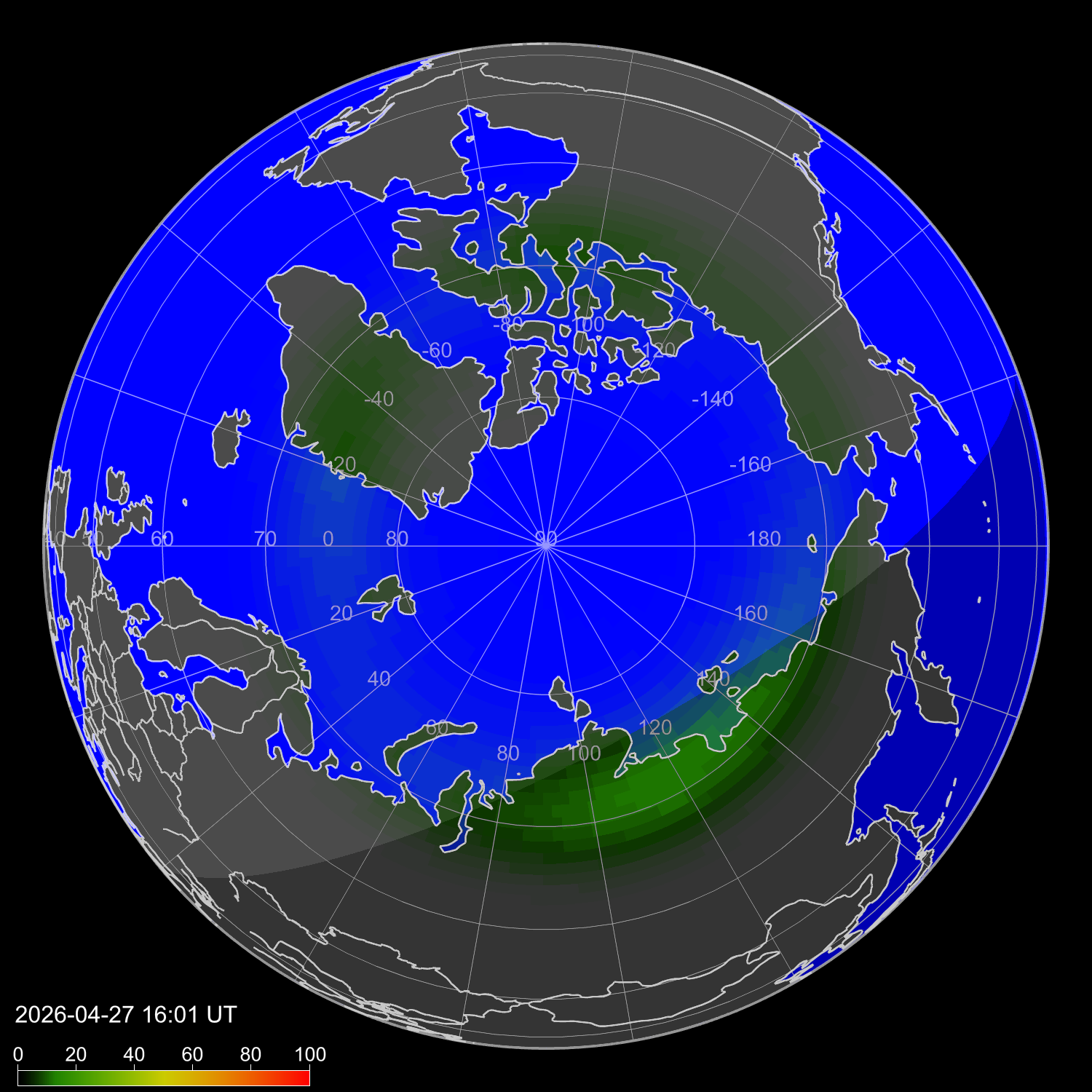 Changes and hourly forecast of the auroral intensity index from 2026-04-26 to 2026-04-27