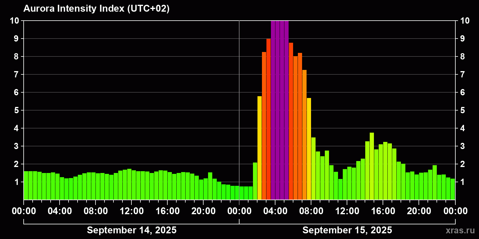 Changes in the auroral intensity index from 2025-09-14 to 2025-09-15 local time