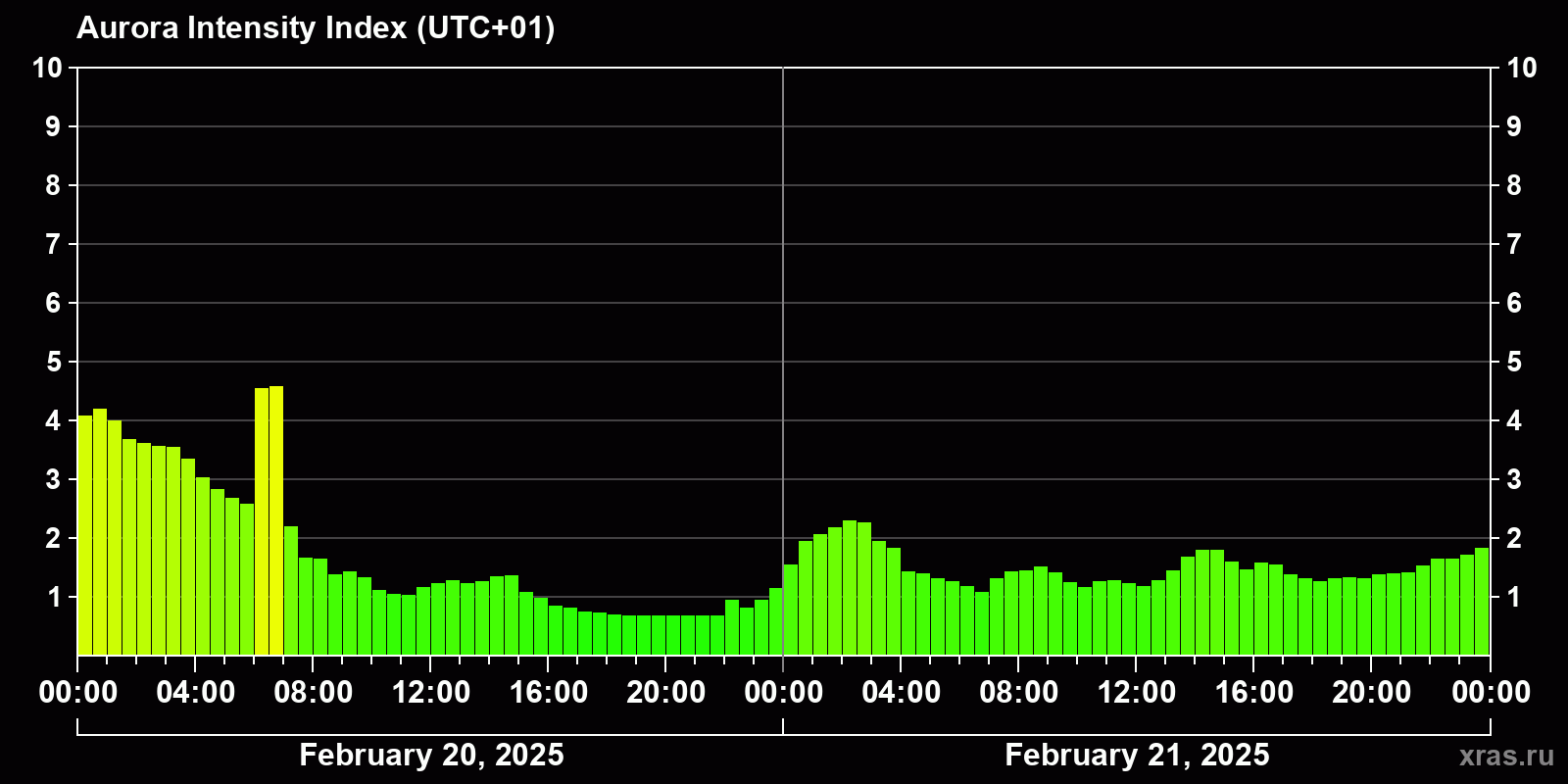 Auroral intensity index and the theoretically possible latitude of observations for nighttime in the Estern Hemisphere as of 2025-02-21 23:58 (end of day) local time