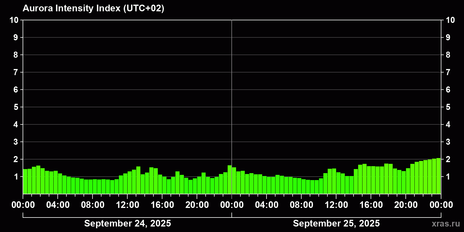 Changes in the auroral intensity index from 2025-09-24 to 2025-09-25 local time