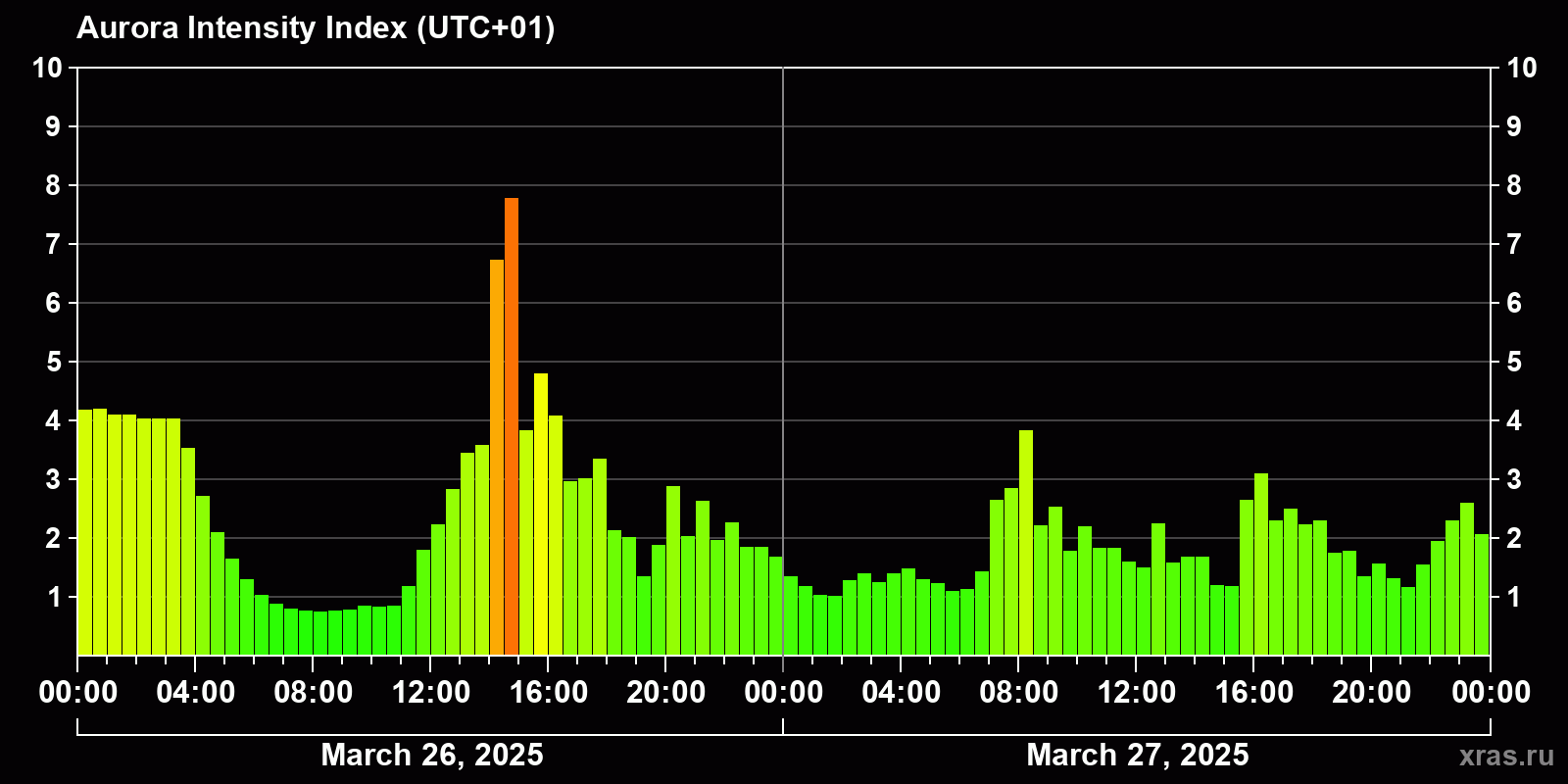Changes in the auroral intensity index from 2025-03-26 to 2025-03-27 local time