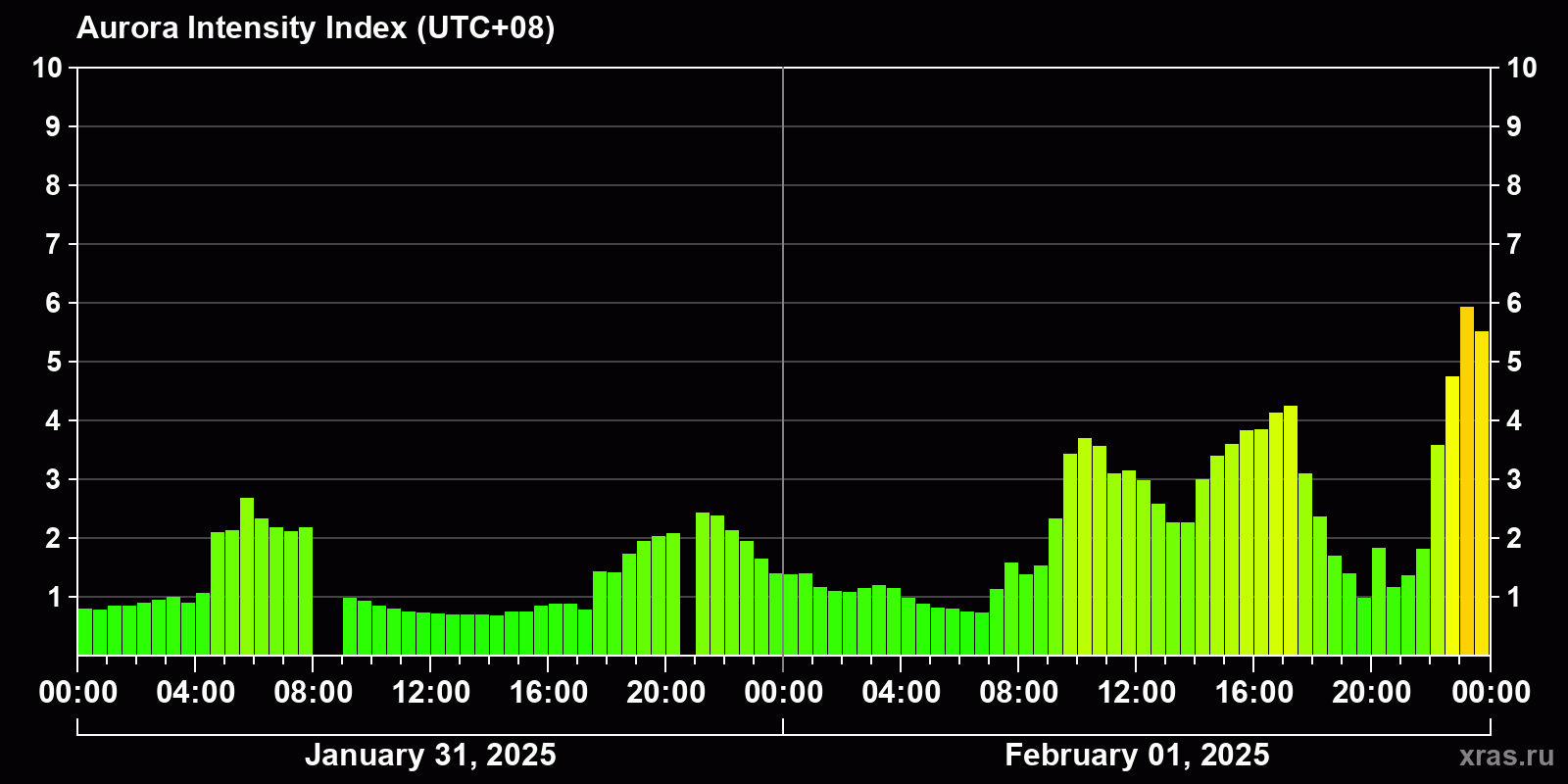 Auroral intensity index and the theoretically possible latitude of observations for nighttime in the Estern Hemisphere as of 2025-02-01 23:47 (end of day) local time