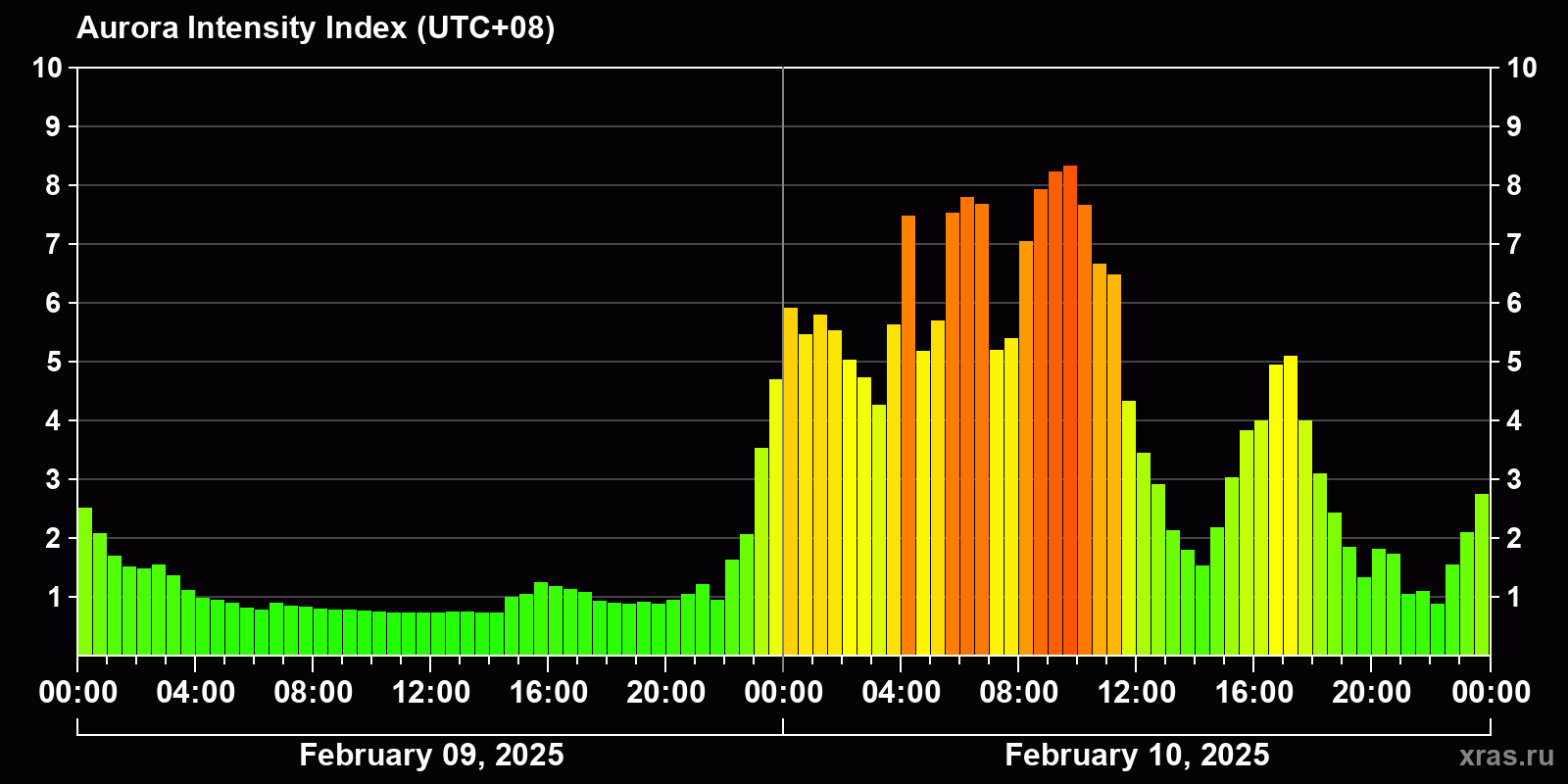 Changes in the auroral intensity index from 2025-02-09 to 2025-02-10 local time