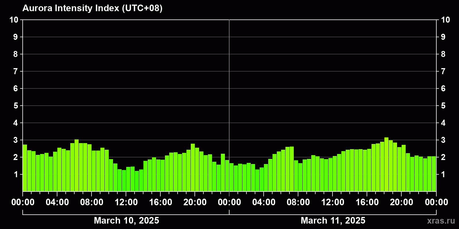 Auroral intensity index and the theoretically possible latitude of observations for nighttime in the Estern Hemisphere as of 2025-03-11 23:50 (end of day) local time