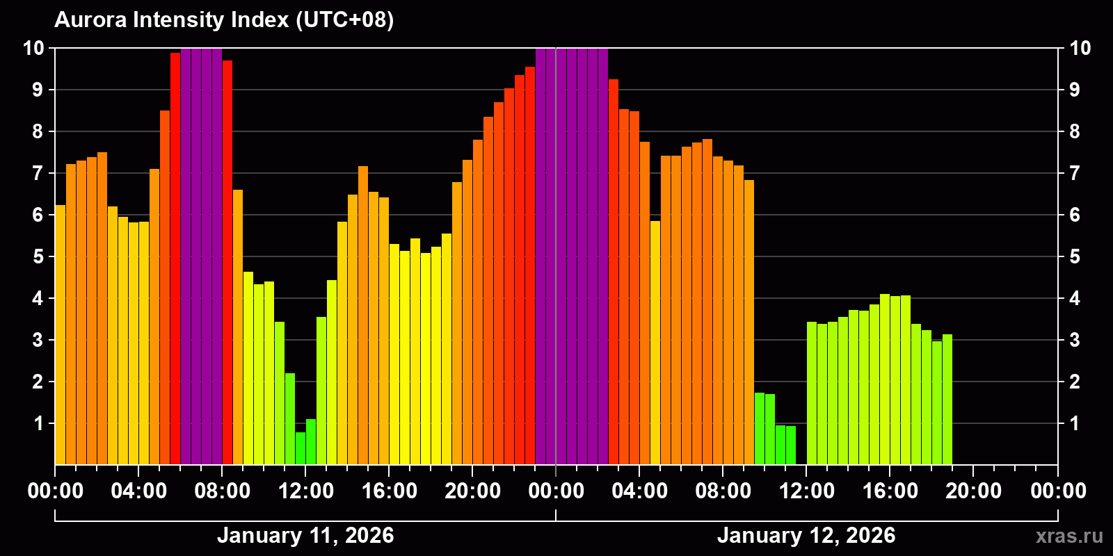 Changes in the auroral intensity index from 2026-01-11 to 2026-01-12 local time