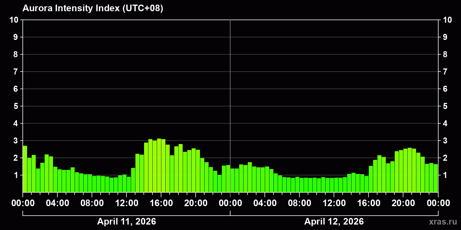 Changes in the auroral intensity index from 2026-04-11 to 2026-04-12 local time