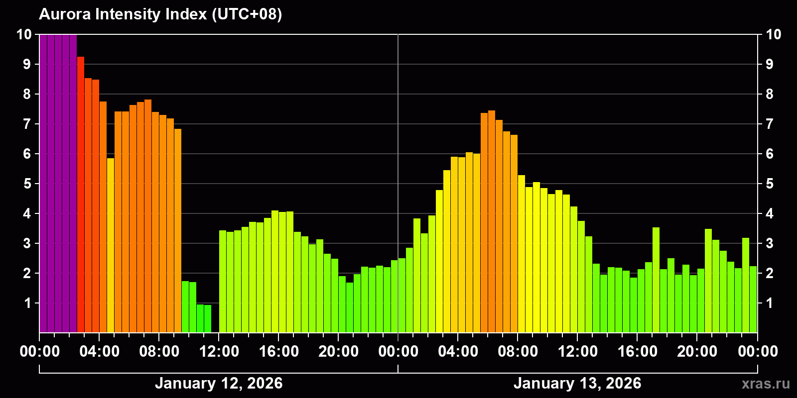 Auroral intensity index and the theoretically possible latitude of observations for nighttime in the Estern Hemisphere as of 2026-01-13 23:47 (end of day) local time