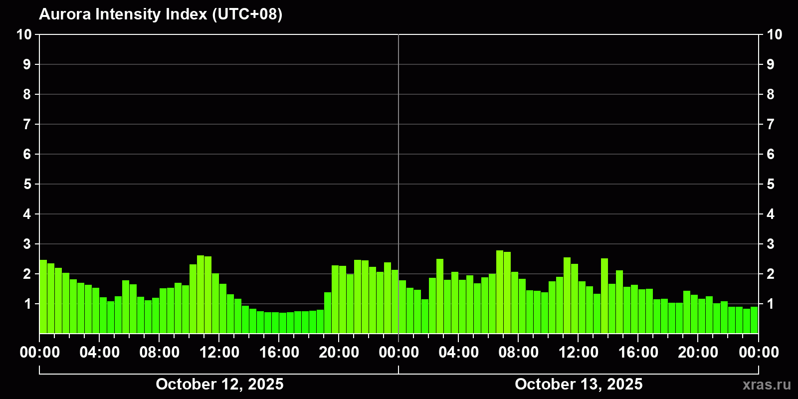 Changes in the auroral intensity index from 2025-10-12 to 2025-10-13 local time