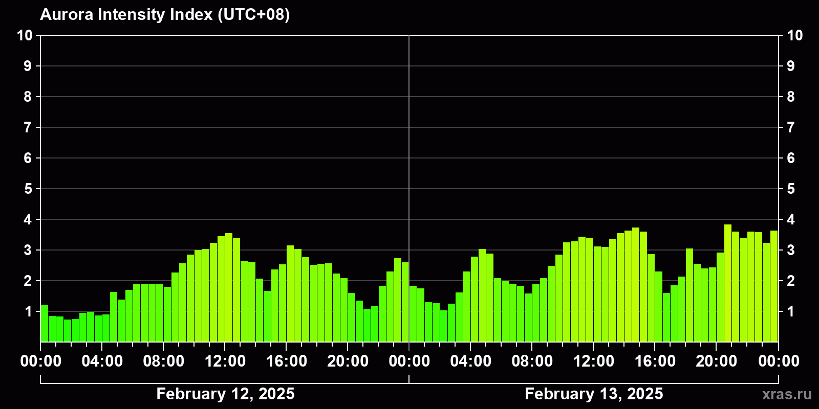 Changes in the auroral intensity index from 2025-02-12 to 2025-02-13 local time