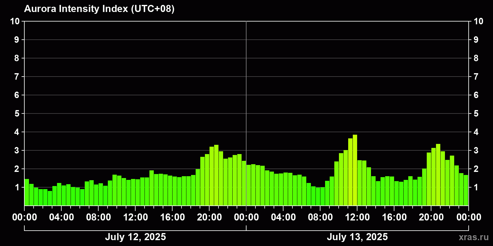 Changes in the auroral intensity index from 2025-07-12 to 2025-07-13 local time