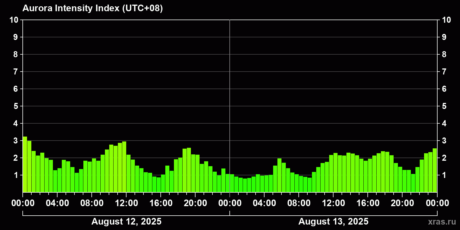 Auroral intensity index and the theoretically possible latitude of observations for nighttime in the Estern Hemisphere as of 2025-08-13 23:45 (end of day) local time