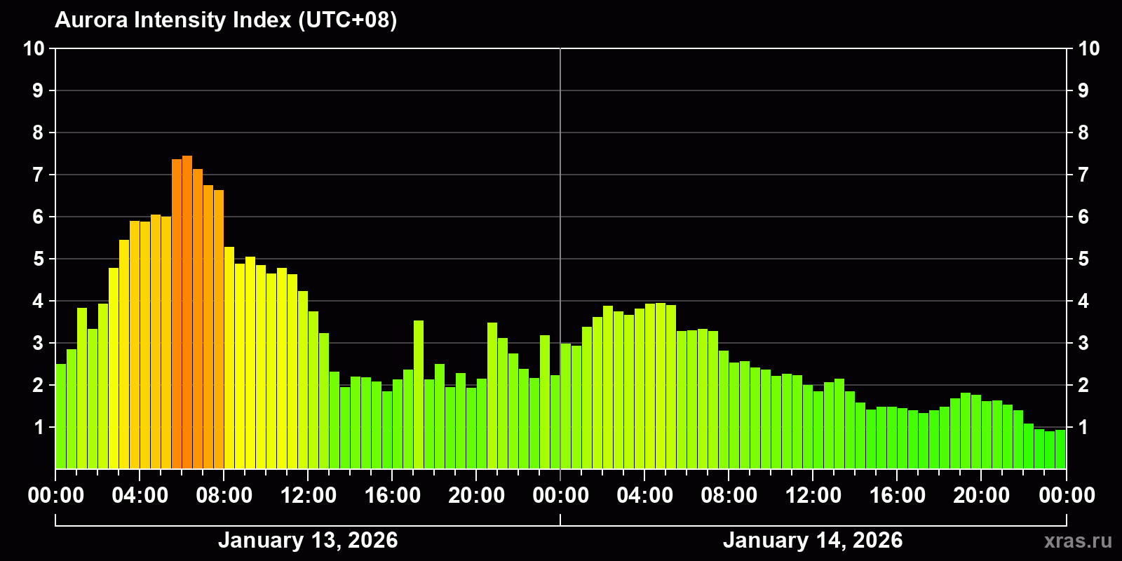 Changes in the auroral intensity index from 2026-01-13 to 2026-01-14 local time