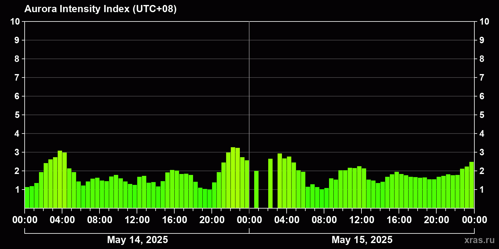 Auroral intensity index and the theoretically possible latitude of observations for nighttime in the Estern Hemisphere as of 2025-05-15 23:51 (end of day) local time