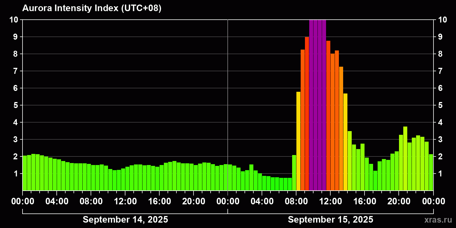 Changes in the auroral intensity index from 2025-09-14 to 2025-09-15 local time