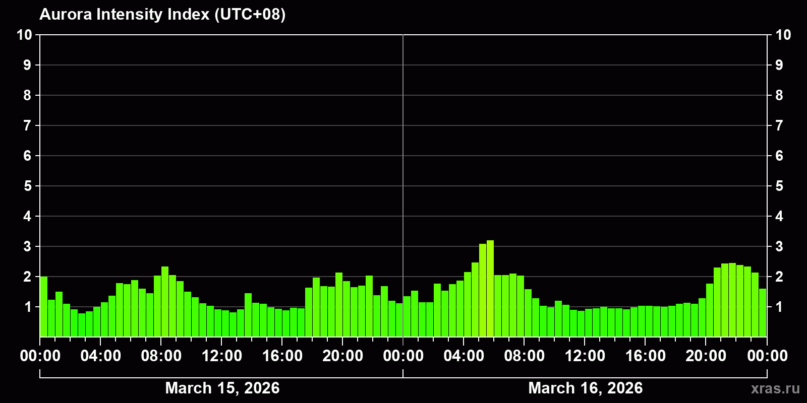 Changes in the auroral intensity index from 2026-03-15 to 2026-03-16 local time