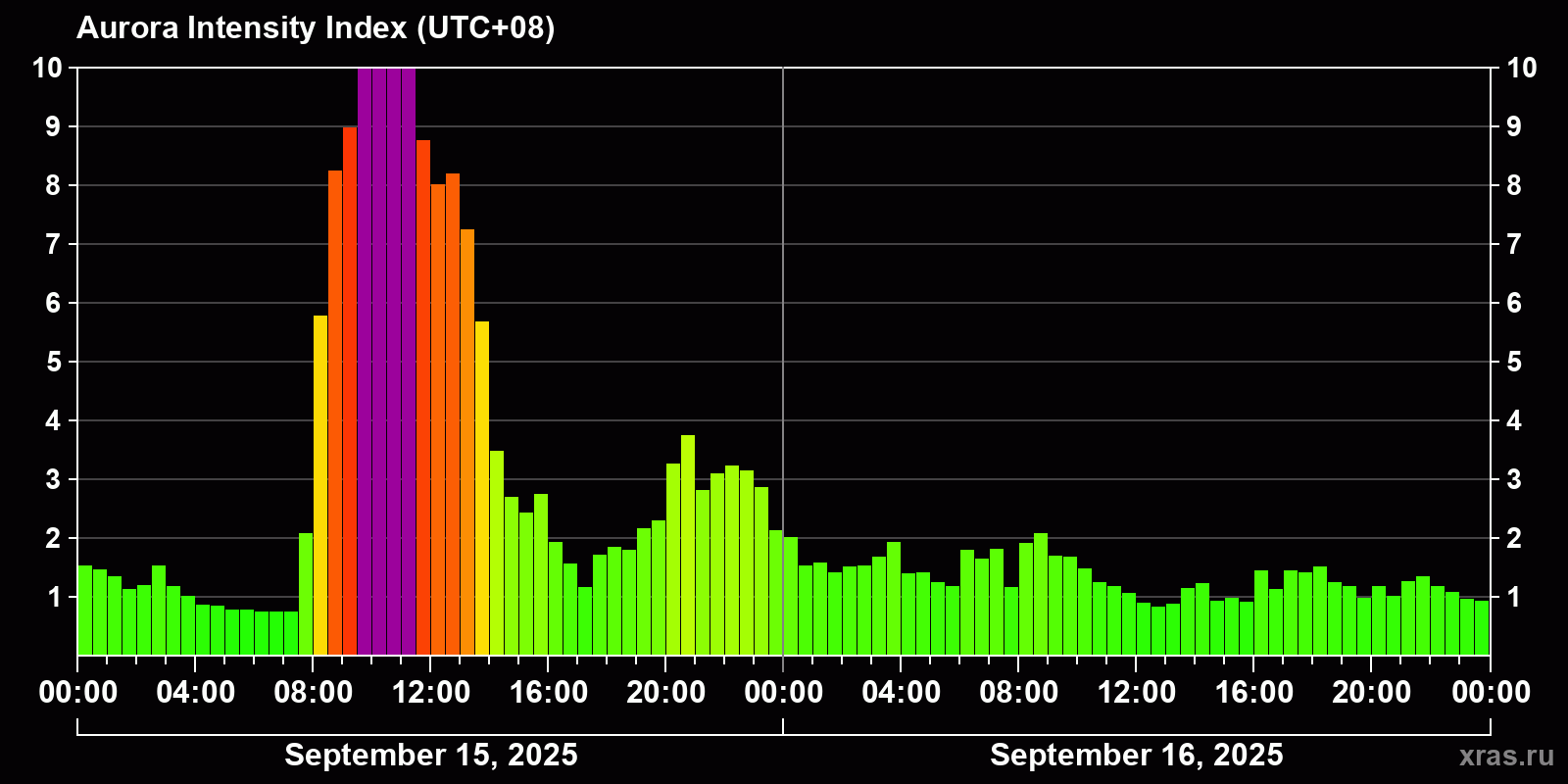 Changes in the auroral intensity index from 2025-09-15 to 2025-09-16 local time