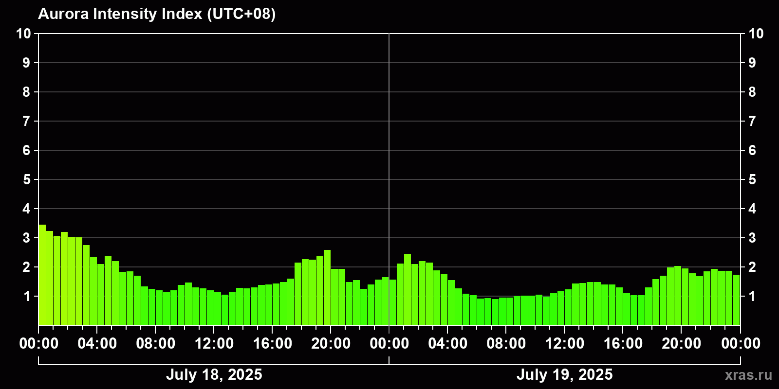 Changes in the auroral intensity index from 2025-07-18 to 2025-07-19 local time