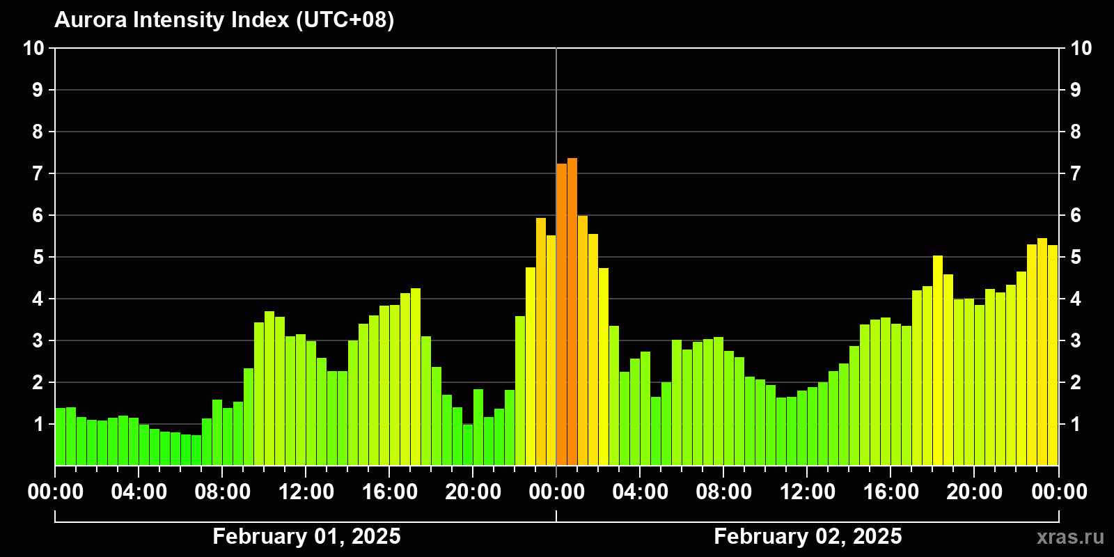 Changes in the auroral intensity index from 2025-02-01 to 2025-02-02 local time