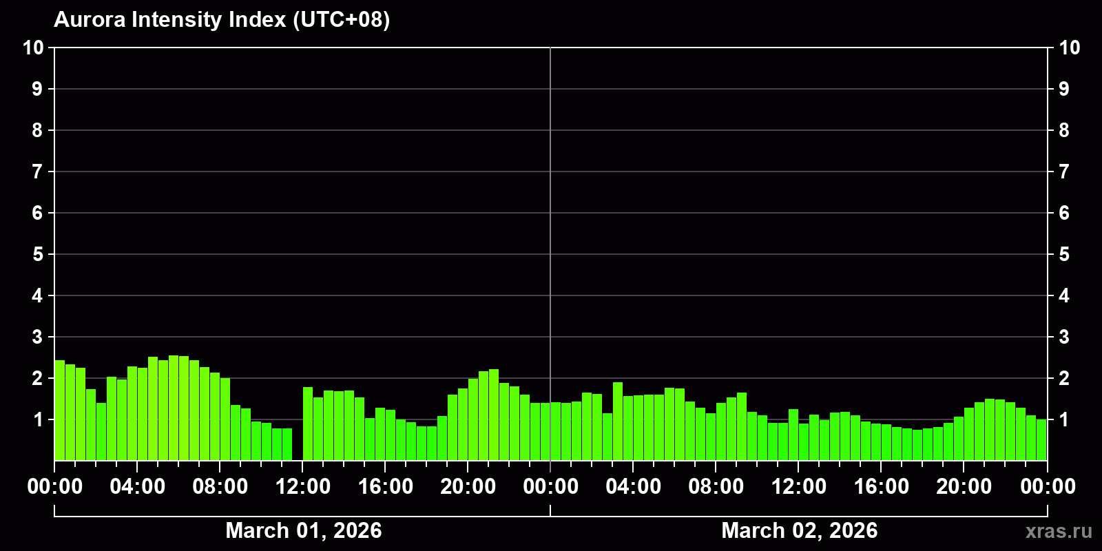 Changes in the auroral intensity index from 2026-03-01 to 2026-03-02 local time
