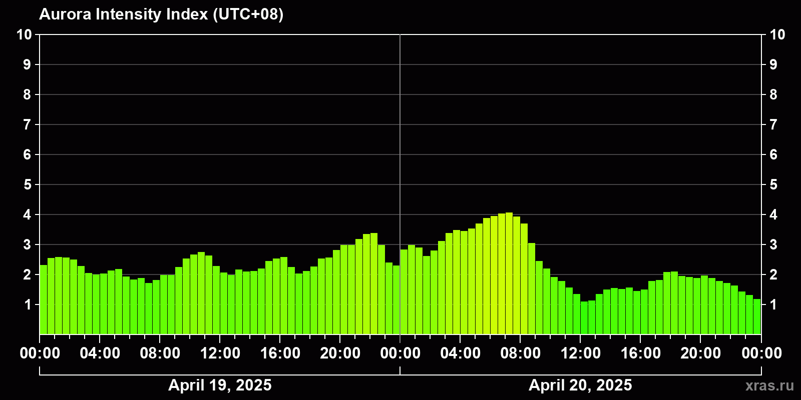 Auroral intensity index and the theoretically possible latitude of observations for nighttime in the Estern Hemisphere as of 2025-04-20 23:54 (end of day) local time