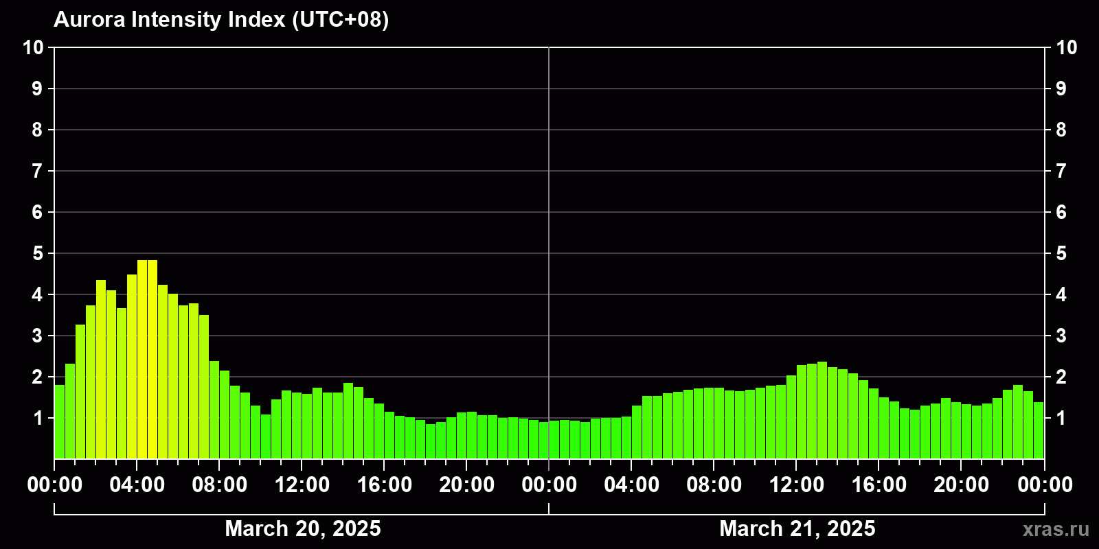 Auroral intensity index and the theoretically possible latitude of observations for nighttime in the Estern Hemisphere as of 2025-03-21 23:55 (end of day) local time