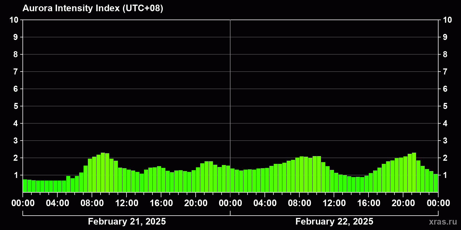 Changes in the auroral intensity index from 2025-02-21 to 2025-02-22 local time