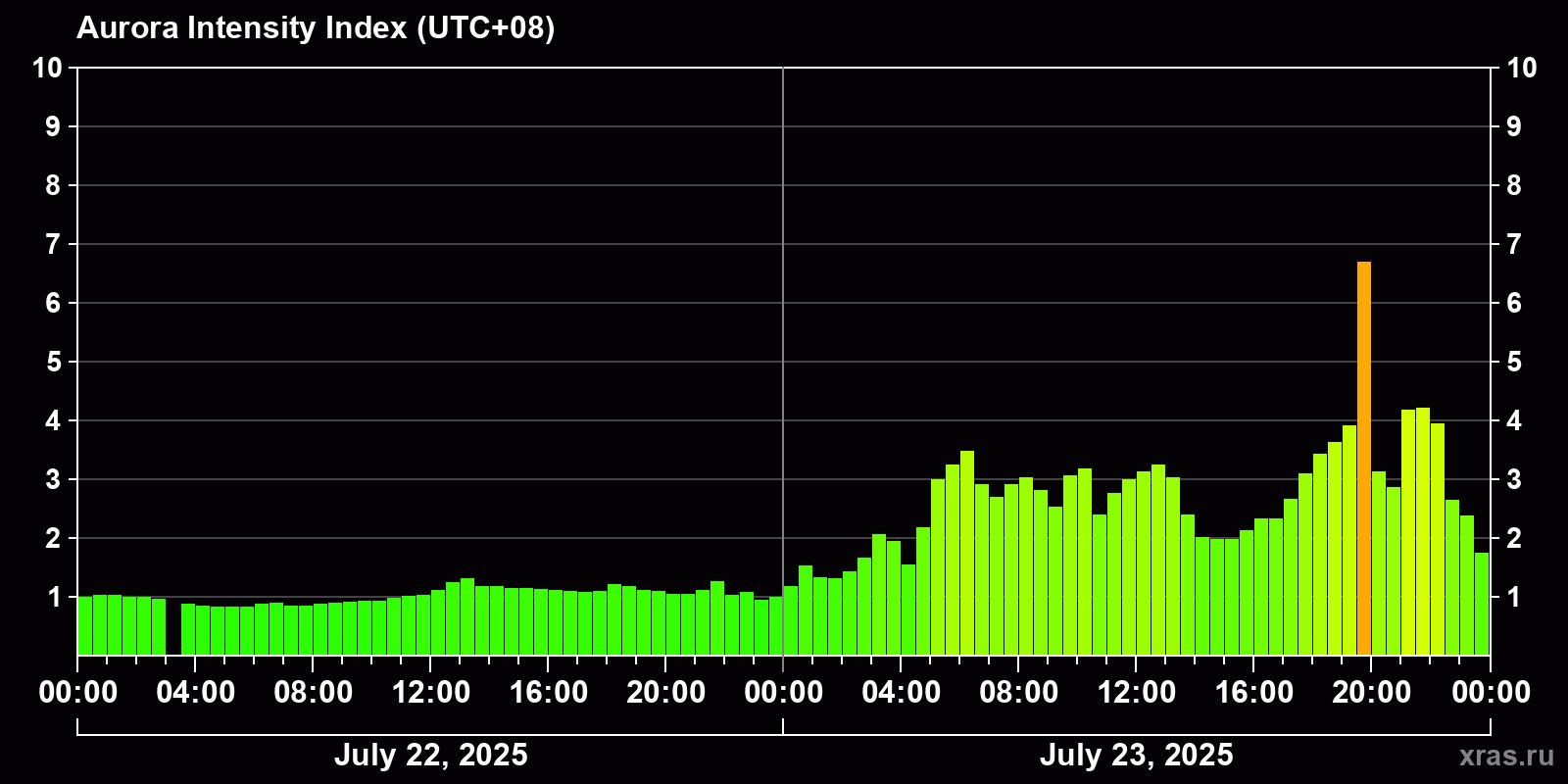 Auroral intensity index and the theoretically possible latitude of observations for nighttime in the Estern Hemisphere as of 2025-07-23 23:59 (end of day) local time