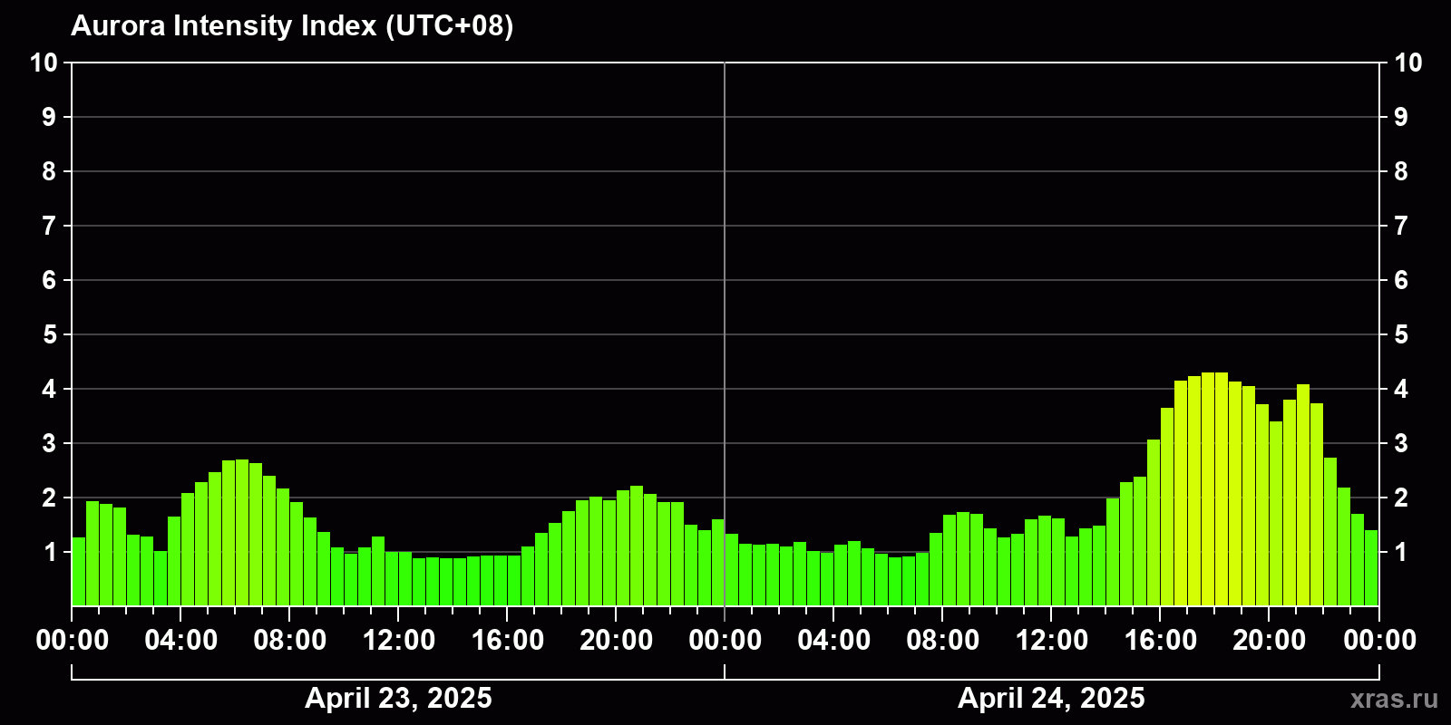 Auroral intensity index and the theoretically possible latitude of observations for nighttime in the Estern Hemisphere as of 2025-04-24 23:39 (end of day) local time