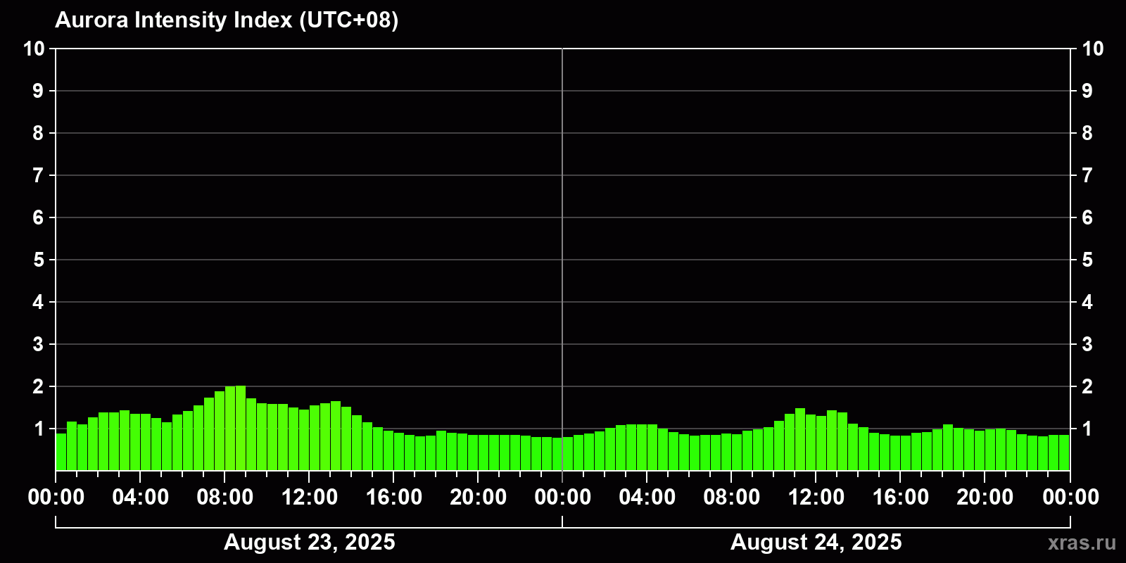 Auroral intensity index and the theoretically possible latitude of observations for nighttime in the Estern Hemisphere as of 2025-08-24 23:46 (end of day) local time
