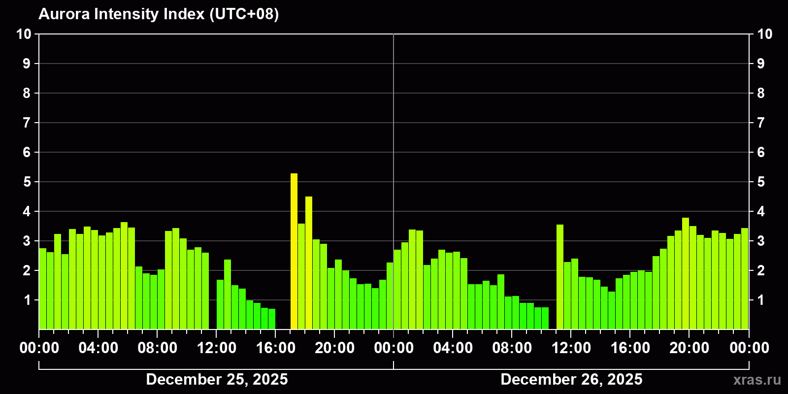 Changes in the auroral intensity index from 2025-12-25 to 2025-12-26 local time