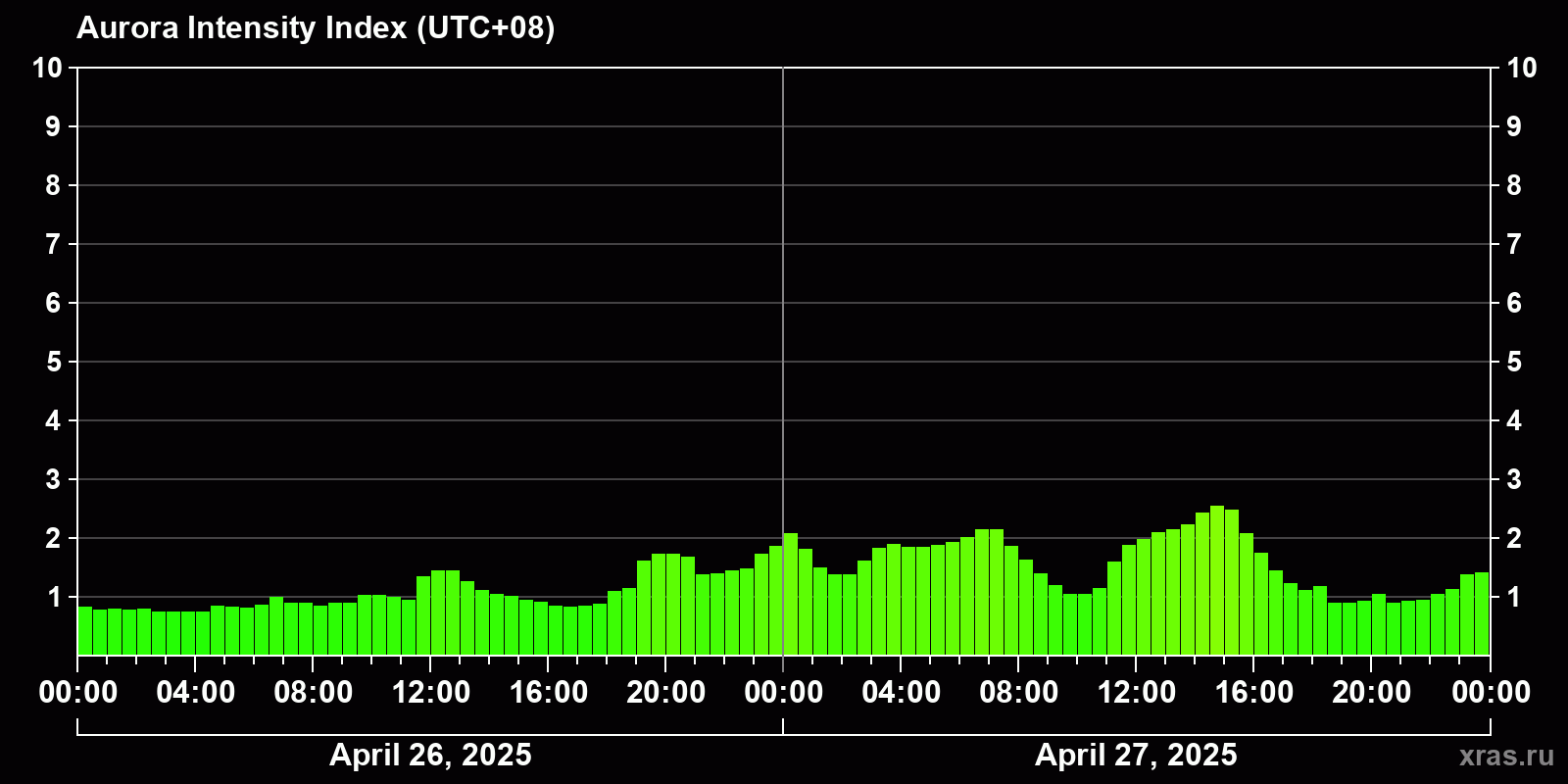 Changes in the auroral intensity index from 2025-04-26 to 2025-04-27 local time