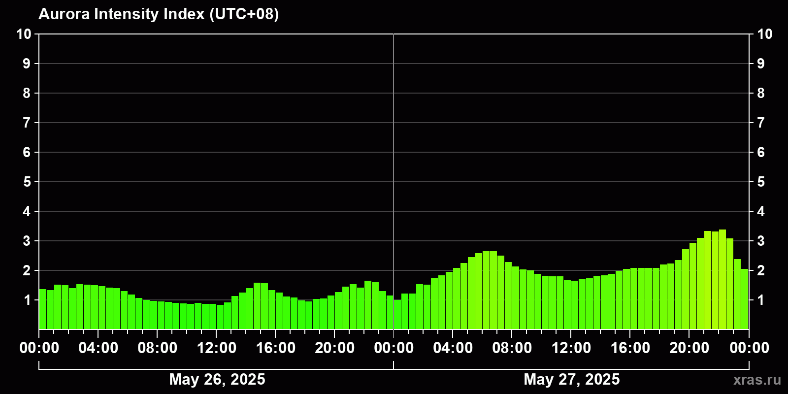 Changes in the auroral intensity index from 2025-05-26 to 2025-05-27 local time