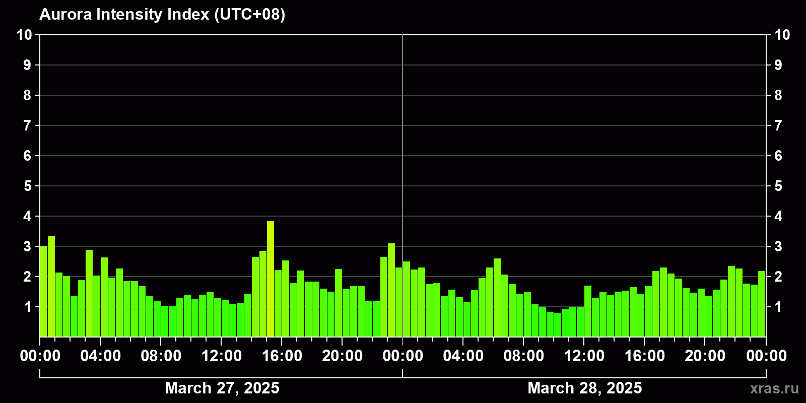 Changes in the auroral intensity index from 2025-03-27 to 2025-03-28 local time
