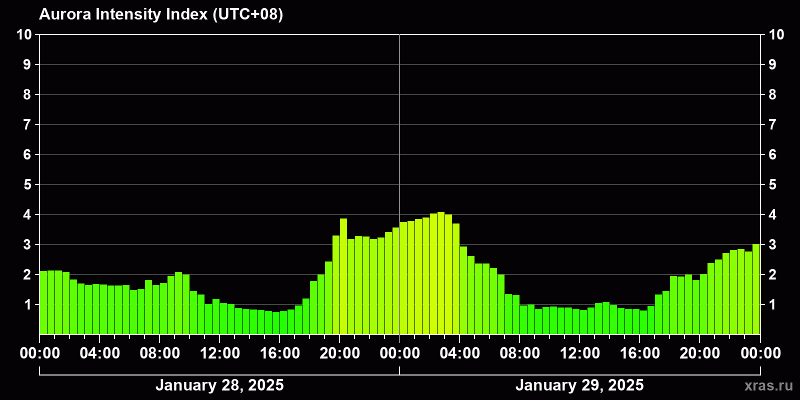 Changes in the auroral intensity index from 2025-01-28 to 2025-01-29 local time