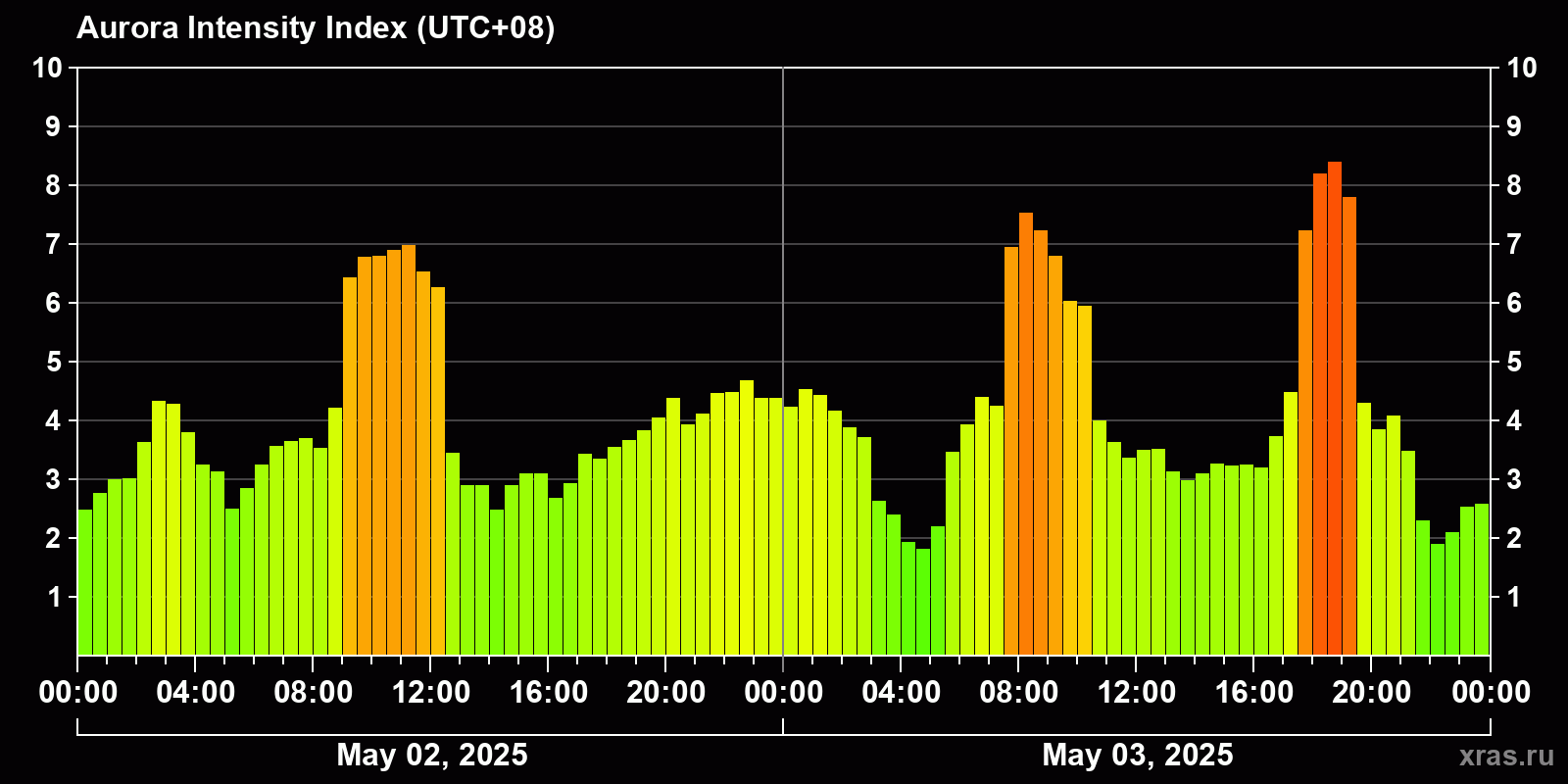 Changes in the auroral intensity index from 2025-05-02 to 2025-05-03 local time