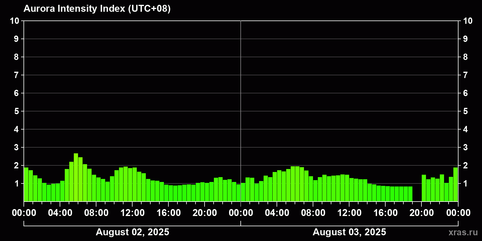 Changes in the auroral intensity index from 2025-08-02 to 2025-08-03 local time