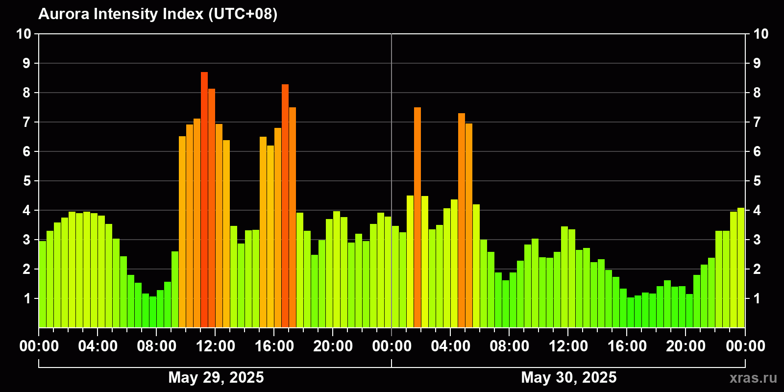 Changes in the auroral intensity index from 2025-05-29 to 2025-05-30 local time