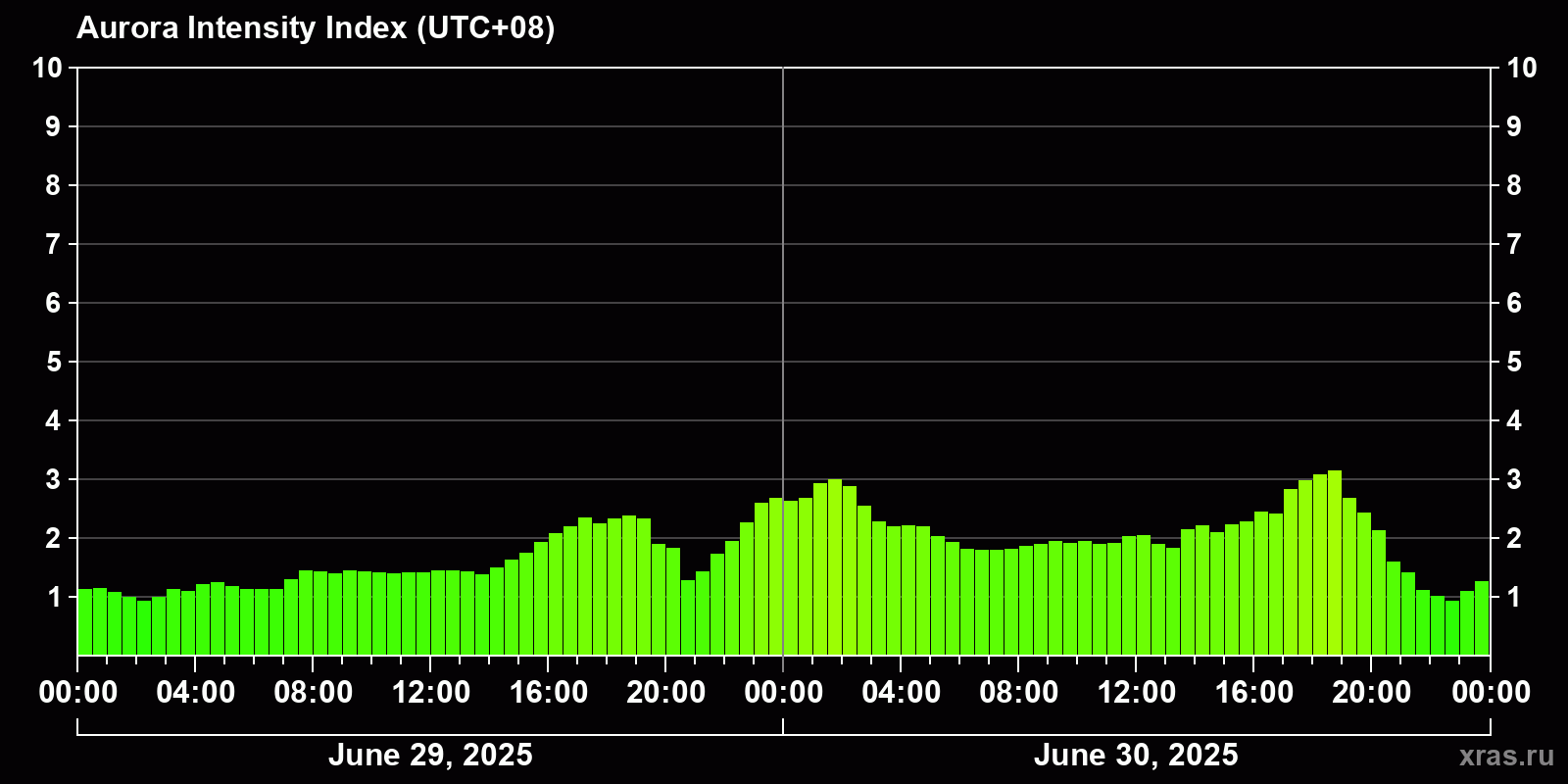 Auroral intensity index and the theoretically possible latitude of observations for nighttime in the Estern Hemisphere as of 2025-06-30 23:50 (end of day) local time